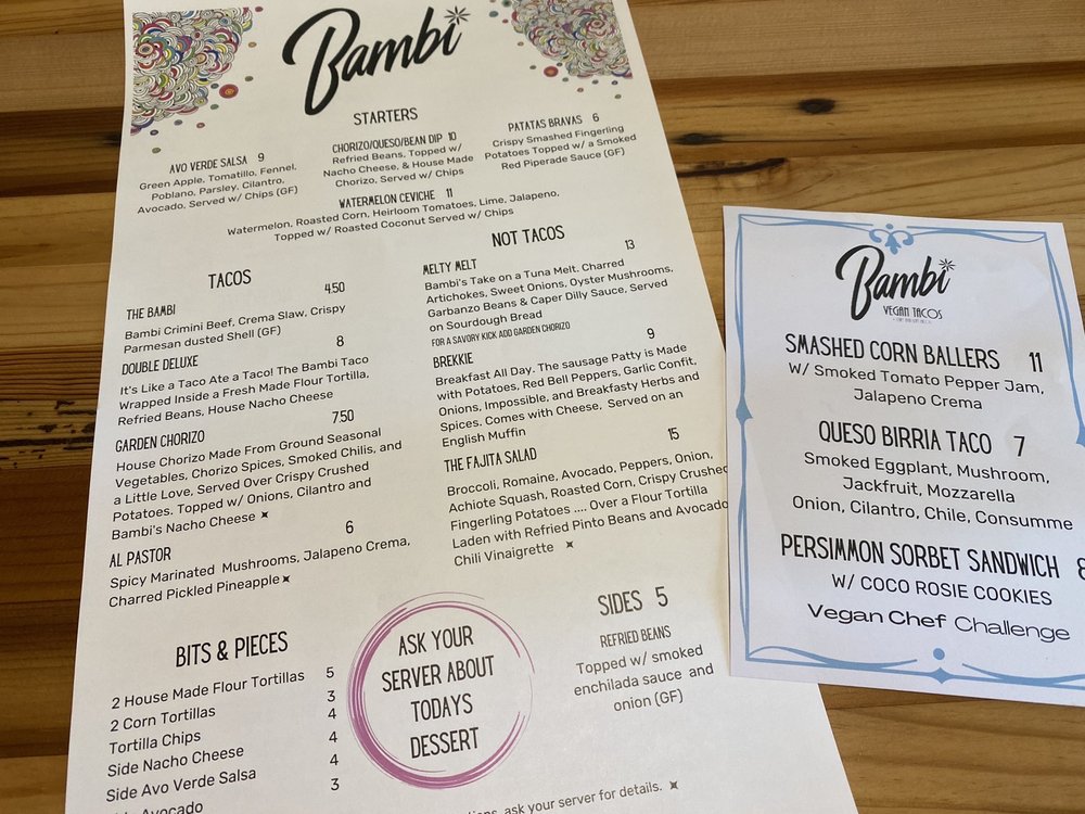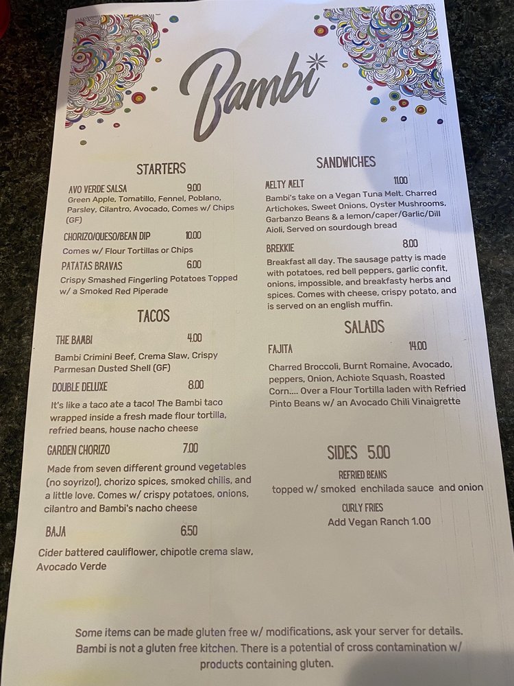 Bambi Vegan Tacos in Sacramento, CA, offers a trendy and vibrant dining experience for both vegans and non-vegans. The menu boasts a variety of flavorful options, including the Garden chorizo taco and Al pastor taco, which are customer favorites. The restaurant also serves unique dishes like the Double deluxe taco and Brekkie sandwich. The Chorizo queso bean dip and Melty Melt are must-try indulgent treats. Customers praise the friendly service and the creative atmosphere of the restaurant. With a focus on providing delicious vegan food, Bambi Vegan Tacos is a top choice for those looking for a flavorful and satisfying dining experience in Sacramento.